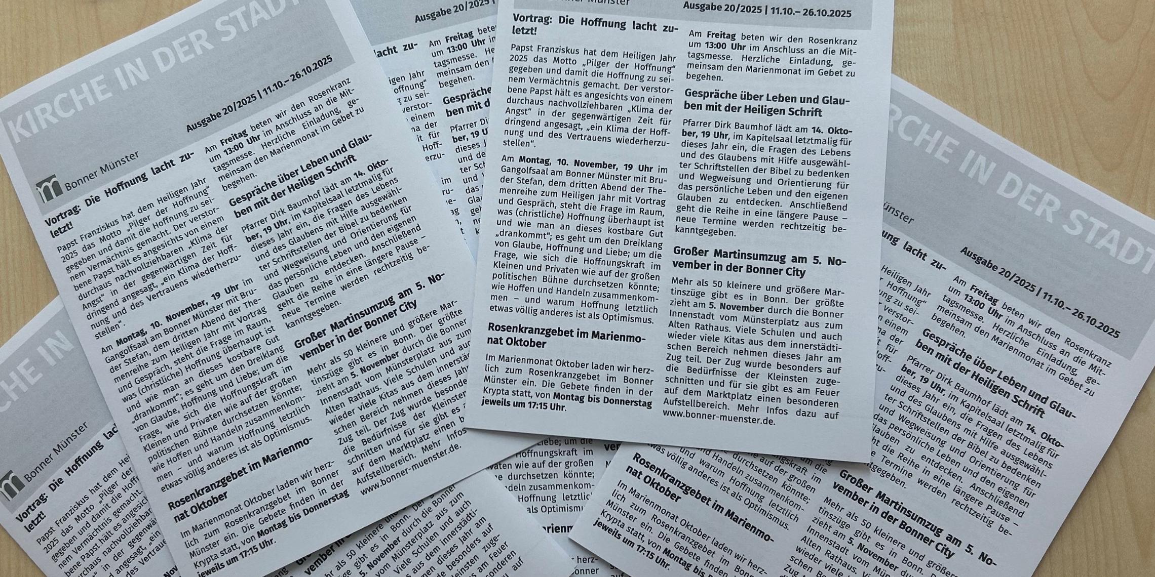 Liebe Gemeindemitglieder von St. Martin und St. Petrus, unsere Wochenzettel sollen künftig gemeinsam gestaltet und herausgegeben werden. Damit der neue gemeinsame Wochenzettel gut zu Ihnen passt, möchten wir Ihre Wünsche und Ideen einbeziehen. Wir freuen uns über Ihre Rückmeldungen und Anregungen – gemeinsam wollen wir den Wochenzettel so gestalten, dass er weiterhin ein hilfreicher Begleiter für unser Gemeindeleben bleibt.